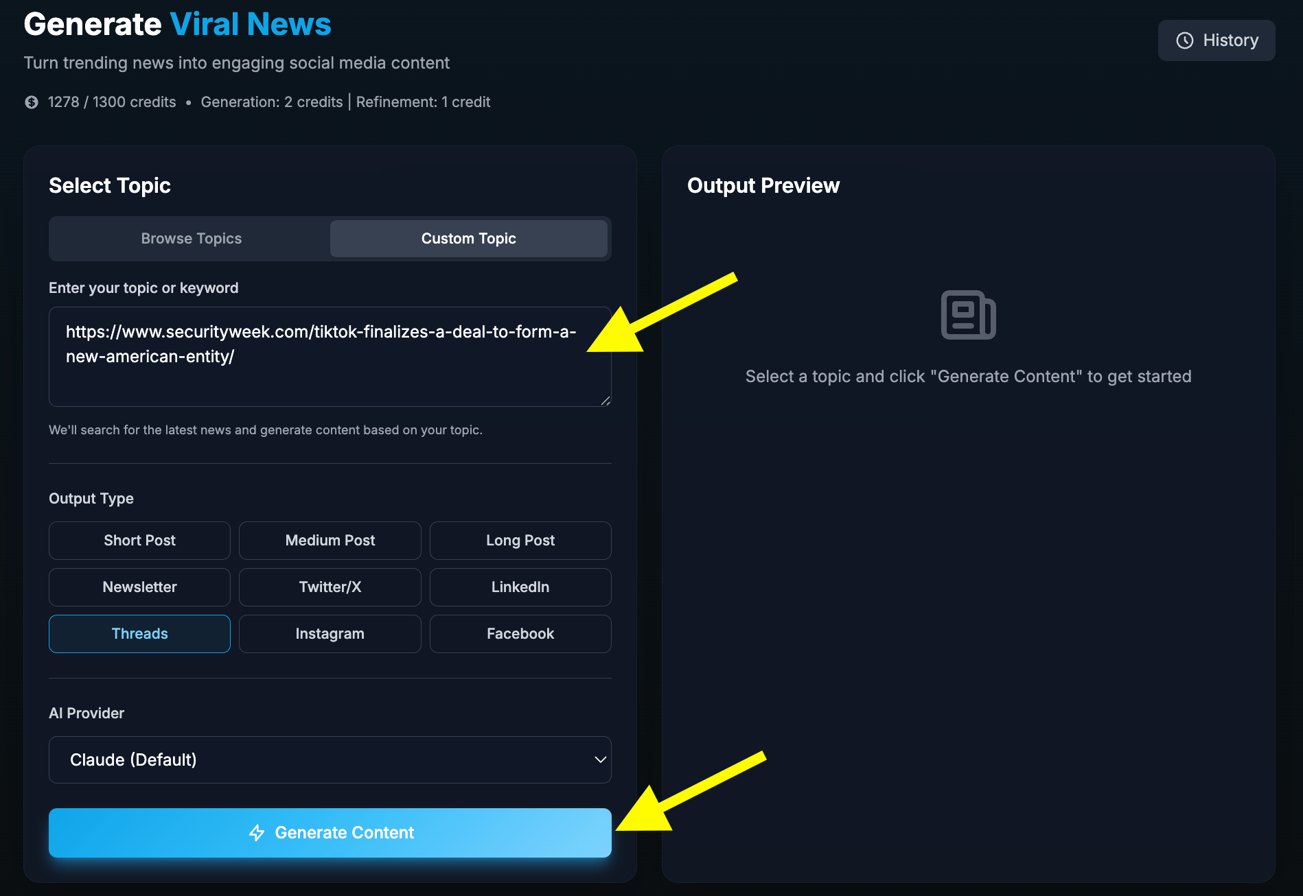 Alternatively, you can insert an article link into “custom topic” and viralsky.ai will generate your content in seconds without any prompting whatsoever.